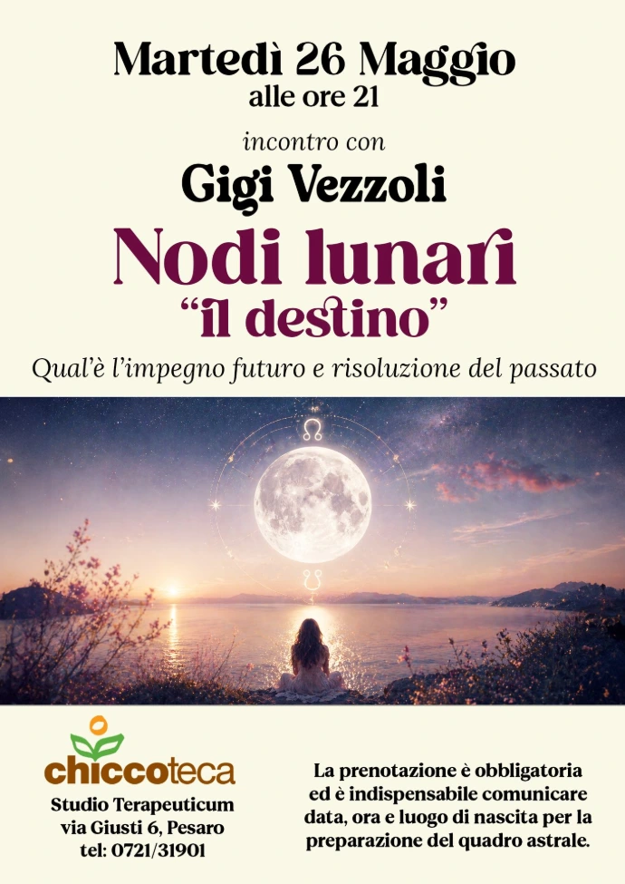 Martedì 26 maggio alle ore 21 si terrà un incontro con Gigi Vezzoli dedicato al tema dei Nodi Lunari, dal titolo “Il destino”.