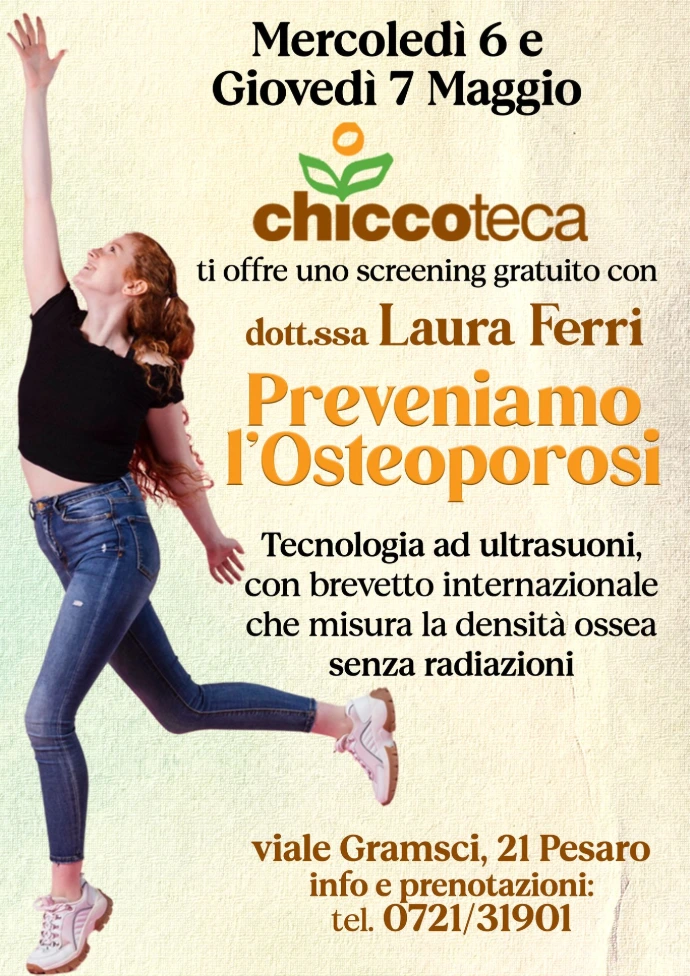 Nelle giornate di mercoledì 6 e giovedì 7 Maggio, Chiccoteca offre la possibilità di partecipare a uno screening gratuito dedicato alla prevenzione dell’osteoporosi, in collaborazione con la dott.ssa Laura Ferri.