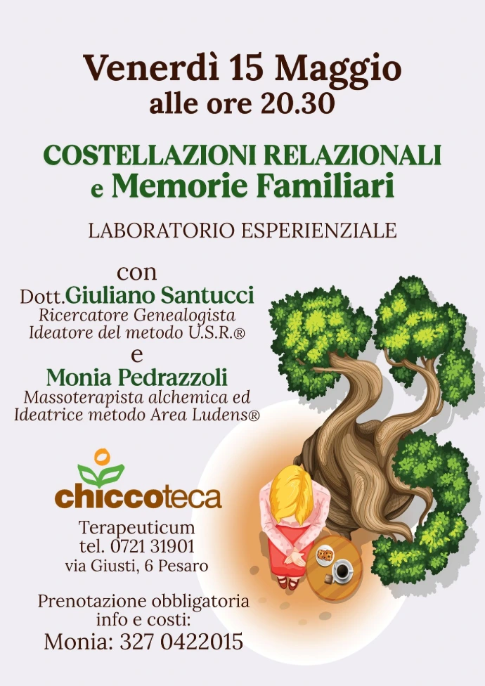 Venerdì 15 Maggio alle ore 20.30, presso Chiccoteca Terapeuticum a Pesaro, si terrà un laboratorio esperienziale dedicato al modello sistemico-familiare e alle memorie bio-genealogiche, un percorso profondo di esplorazione personale e consapevolezza.