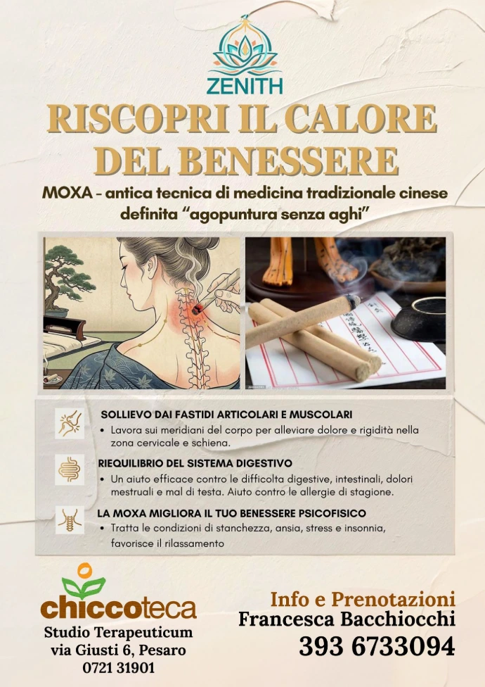 La moxa è una tecnica della medicina tradizionale cinese che utilizza il calore per stimolare specifici punti del corpo lungo i meridiani energetici. È spesso definita “agopuntura senza aghi”, perché lavora sugli stessi principi ma in modo più dolce e non invasivo.
