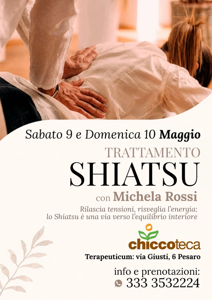 Sabato 9 e Domenica 10 Maggio, presso Chiccoteca – Studio Terapeuticum, sarà possibile partecipare a una giornata dedicata al benessere attraverso il trattamento Shiatsu con Michela Rossi.