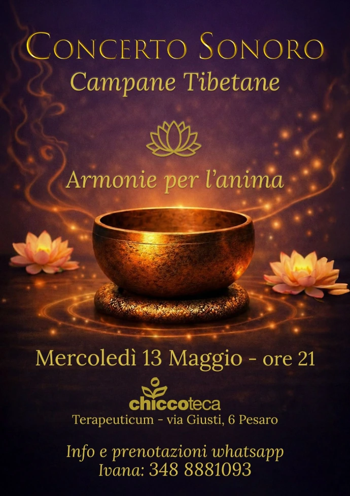 Mercoledì 13 Maggio alle ore 21, presso Chiccoteca – Studio Terapeuticum, si terrà un suggestivo concerto sonoro con campane tibetane, un’esperienza immersiva dedicata al rilassamento e all’armonia interiore.