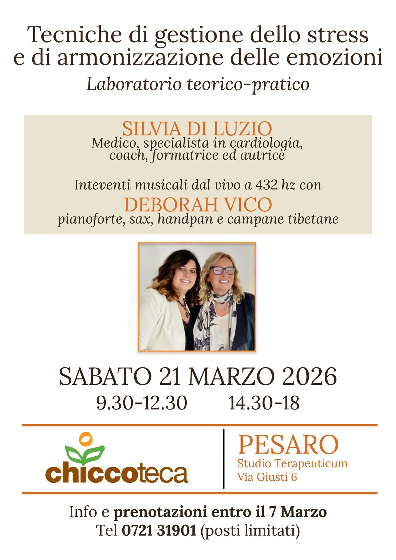Sabato 21 marzo 2026 presso Chiccoteca – Studio Terapeuticum a Pesaro si terrà il laboratorio teorico-pratico “Tecniche di gestione dello stress e di armonizzazione delle emozioni”, una giornata dedicata alla comprensione e alla sperimentazione di strumenti concreti per lavorare sullo stress e sulle emozioni.