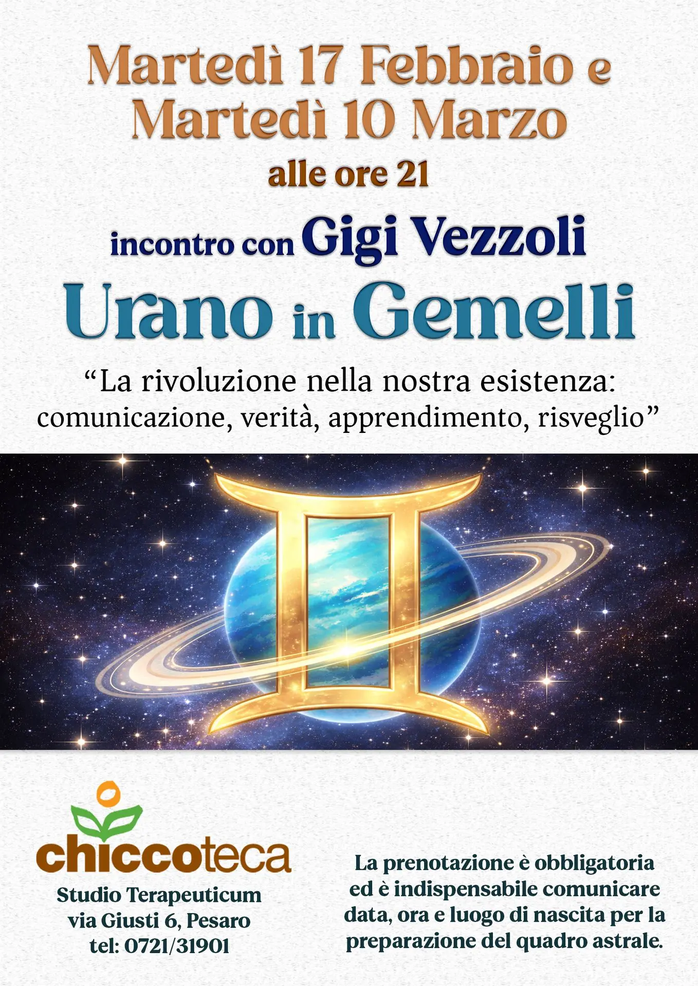 Nei mesi di febbraio e marzo Chiccoteca – Studio Terapeuticum ospita due serate dedicate a un tema astrologico di grande impatto collettivo e personale: Urano in Gemelli. Un incontro di approfondimento guidato da Gigi Vezzoli, pensato per comprendere come questo importante transito stia influenzando e influenzerà il nostro modo di pensare, comunicare e apprendere.