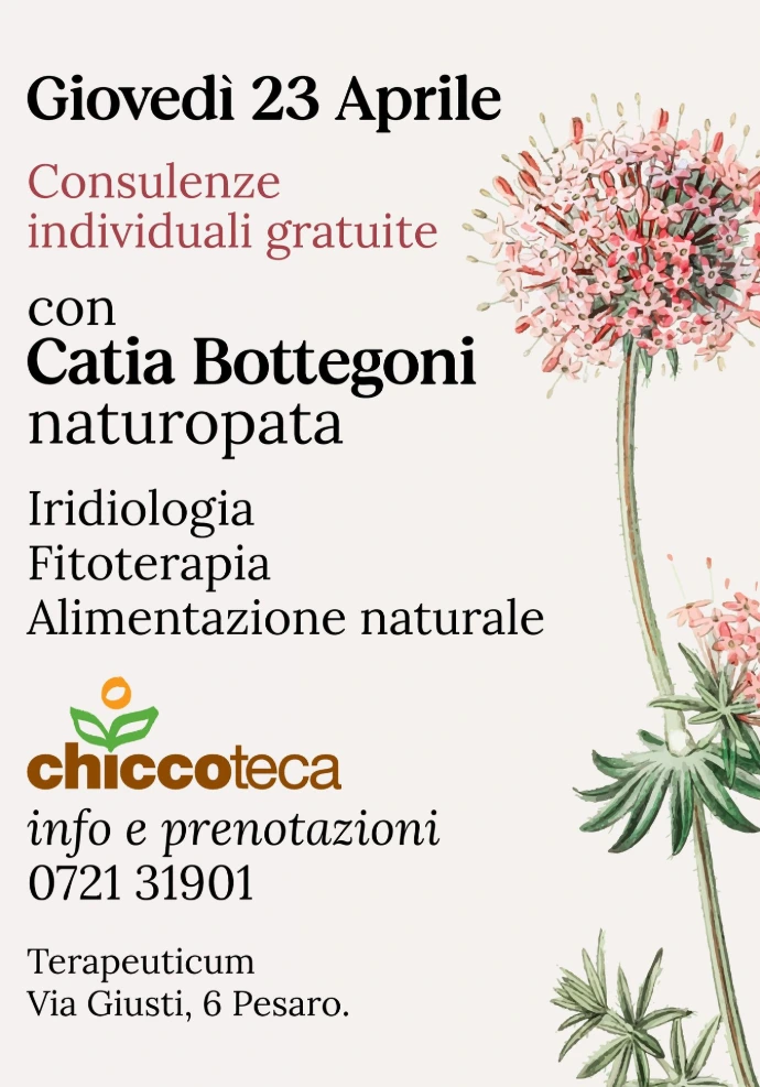 Giovedì 23 Aprile, presso Chiccoteca – Studio Terapeuticum di Pesaro, si terrà una giornata dedicata al benessere naturale con consulenze individuali gratuite guidate dalla naturopata Catia Bottegoni.
